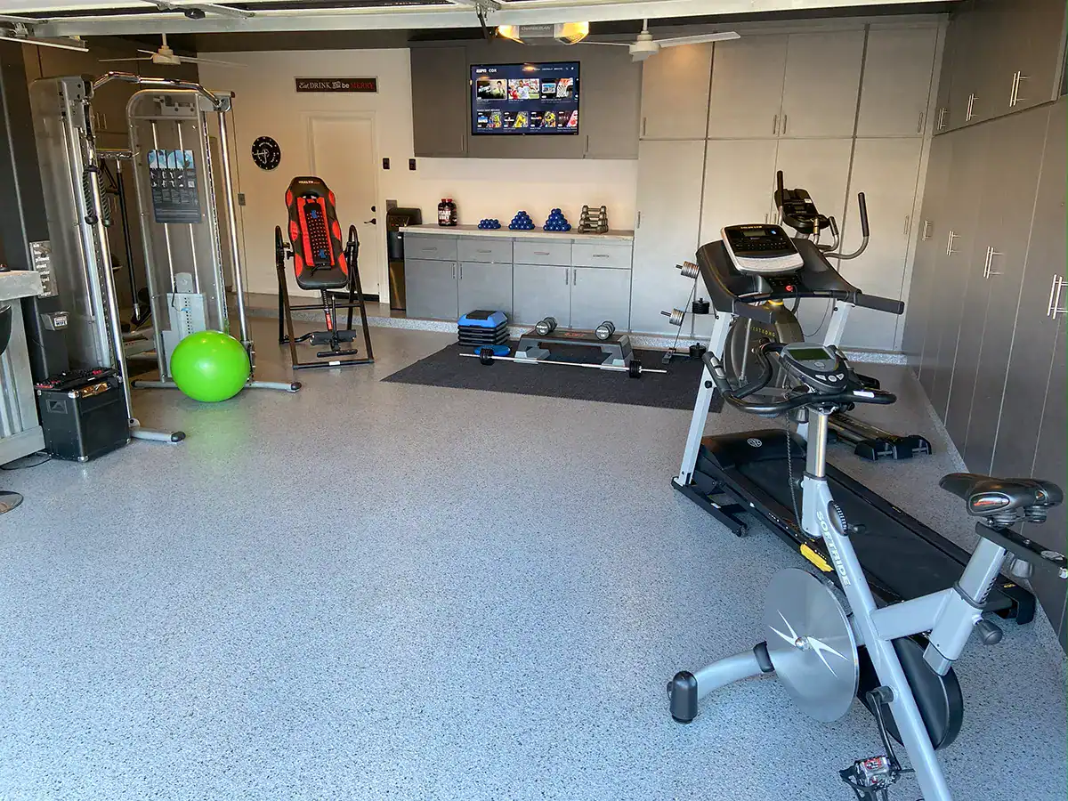 With a garage floor coating, you can set up a small yoga studio, a spin bike corner, or even a martial arts practice area. The coated surface makes cleanup easy and creates a safe, stable base no matter how intense the workout.
