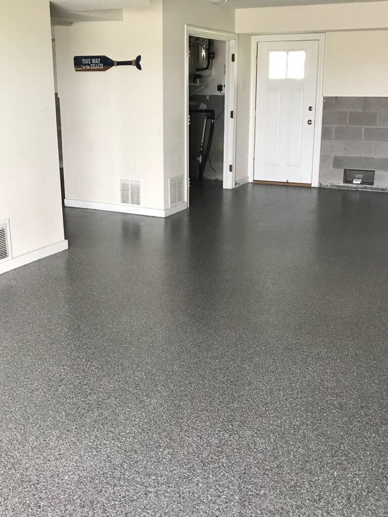 Their concrete was in great condition, as the house was recently built so our installers were able to get in there, prep and apply our 5-layer epoxy flooring system with ease. This system contains a diamond grind, 2 coats of our 100% solids epoxy, a full chip broadcast and 2 coats of our Poly-Hybrid clear coat. Our Poly-Hybrid clear coat contains a proprietary blend of Polyaspartic and Polyurea creating the perfect shine and finish. Our floors all come with an anti-slip additive built in to lower the slip factor when wet. Since the shore has such high moisture in the air from the ocean and bay, we almost always add a moisture barrier on these jobs. This protects the epoxy floor from being damaged from water coming under the concrete.